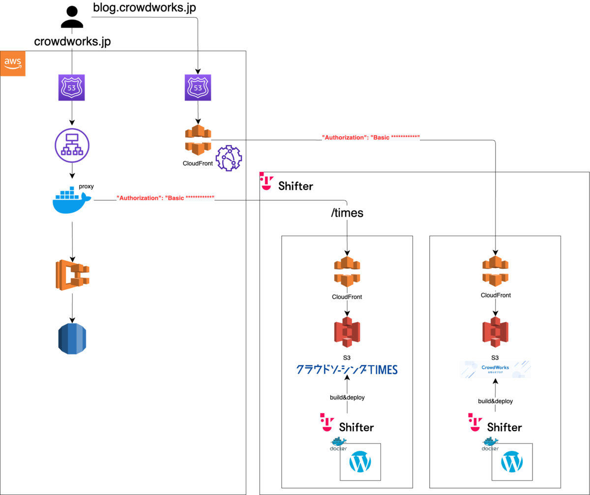そのための代替手段として、ShifterのBasic認証設定をかけたまま、proxyサーバを前段に置きBasic認証を通すようにして クラウドワークスドメインのURLであれば問題なく見れるようにし、ShifterのFQDNにアクセスがあった場合は、Basic認証により見れないよう対応を行いました。