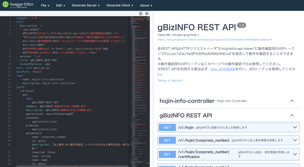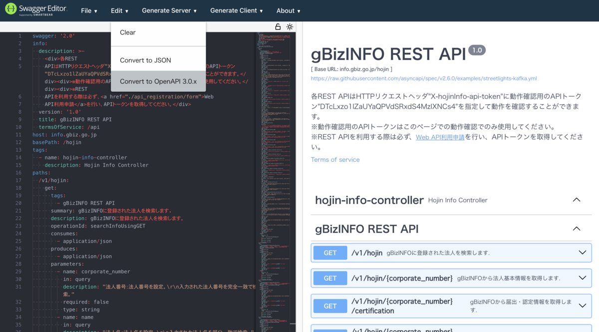 スキーマデータはhttps://info.gbiz.go.jp/hojin/v2/api-docs から確認ができますが、JSON形式なためSwagger EditorからOpenAPIフォーマットへ変換します。